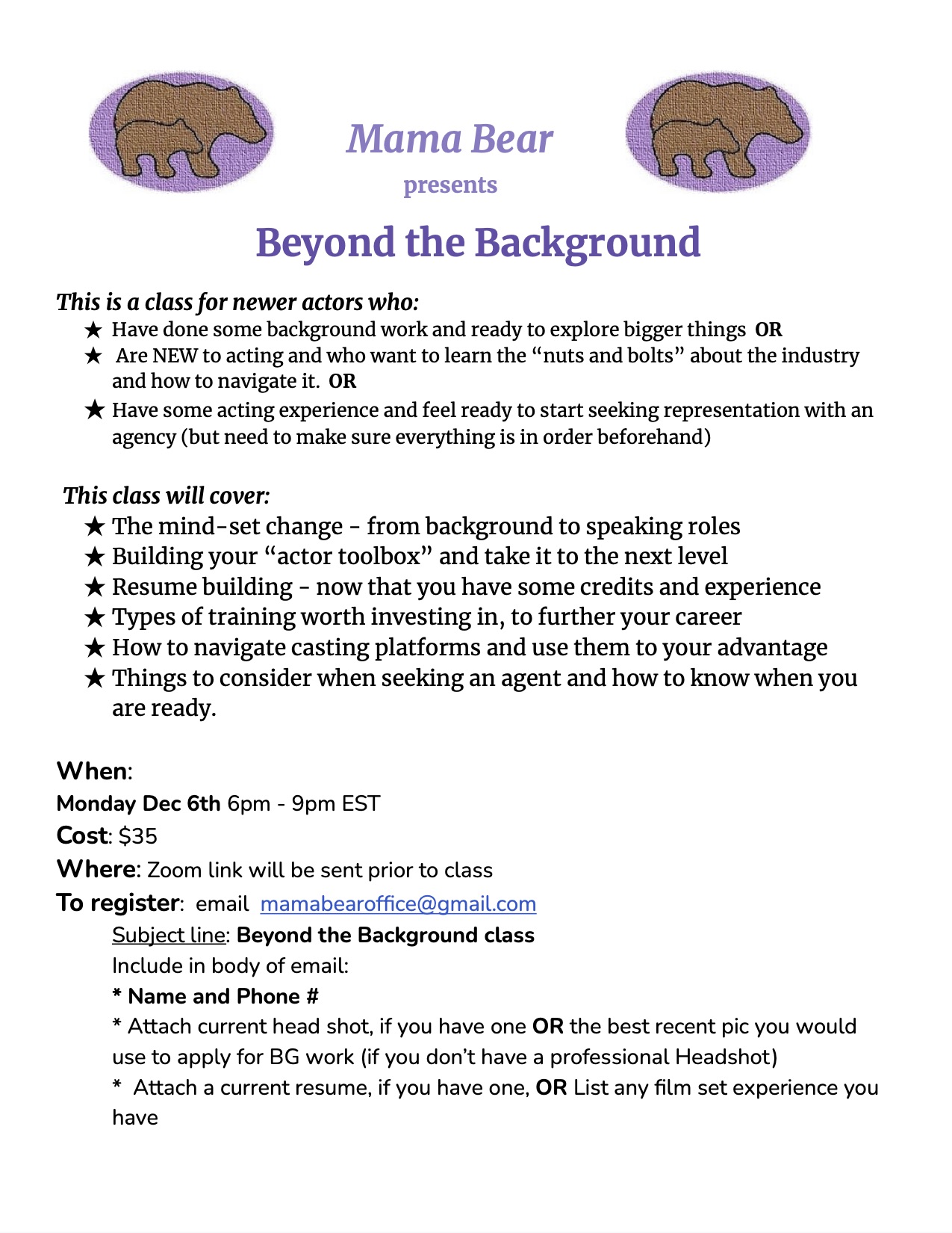 As Mama Bear, I am dedicated to helping productions fill their casting needs.  I enjoy finding talent for speaking or non-speaking roles for Film, TV or commercial productions.  I also love helping actors by empowering them with valuable up-to-date knowledge in this fast pace film industry.  I offer services such as individual consultations, Self Taping Audition/coaching, group teaching for those interested in learning more about how the film industry works. From entry level work as a Background Extra to the exciting world "Beyond the Background" I teach actors all about the "Biz" as they pursue speaking roles by taking acting classes, putting resumes together and understanding the art of self-taping as well as understanding how to navigate actor profile online platforms.  I have great connections with amazing acting coaches and some of the Southeast's most in-demand head shot photographers.  I am based in the Aiken, SC/Augusta, GA area and have  a great rapport with film actors and film communities in nearby cities such as Atlanta, Savannah, Charleston, and Charlotte.  I'm not only a casting director, I'm also an actor.  Find out more about me on my IMDb page.